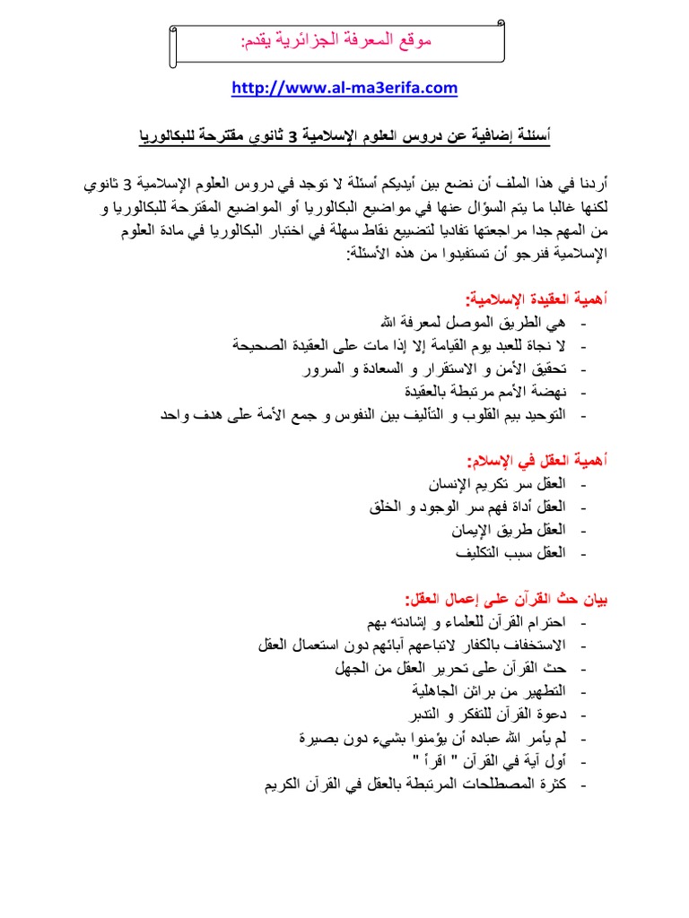 أسئلة مقترحة للبكالوريا في العلوم الإسلامية سنة ثالثة ثانوي Pdf