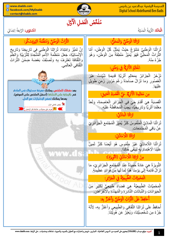 ملخصات دروس الفصل الاول لمادة التربية المدنية للسنة الرابعة الجيل الثاني